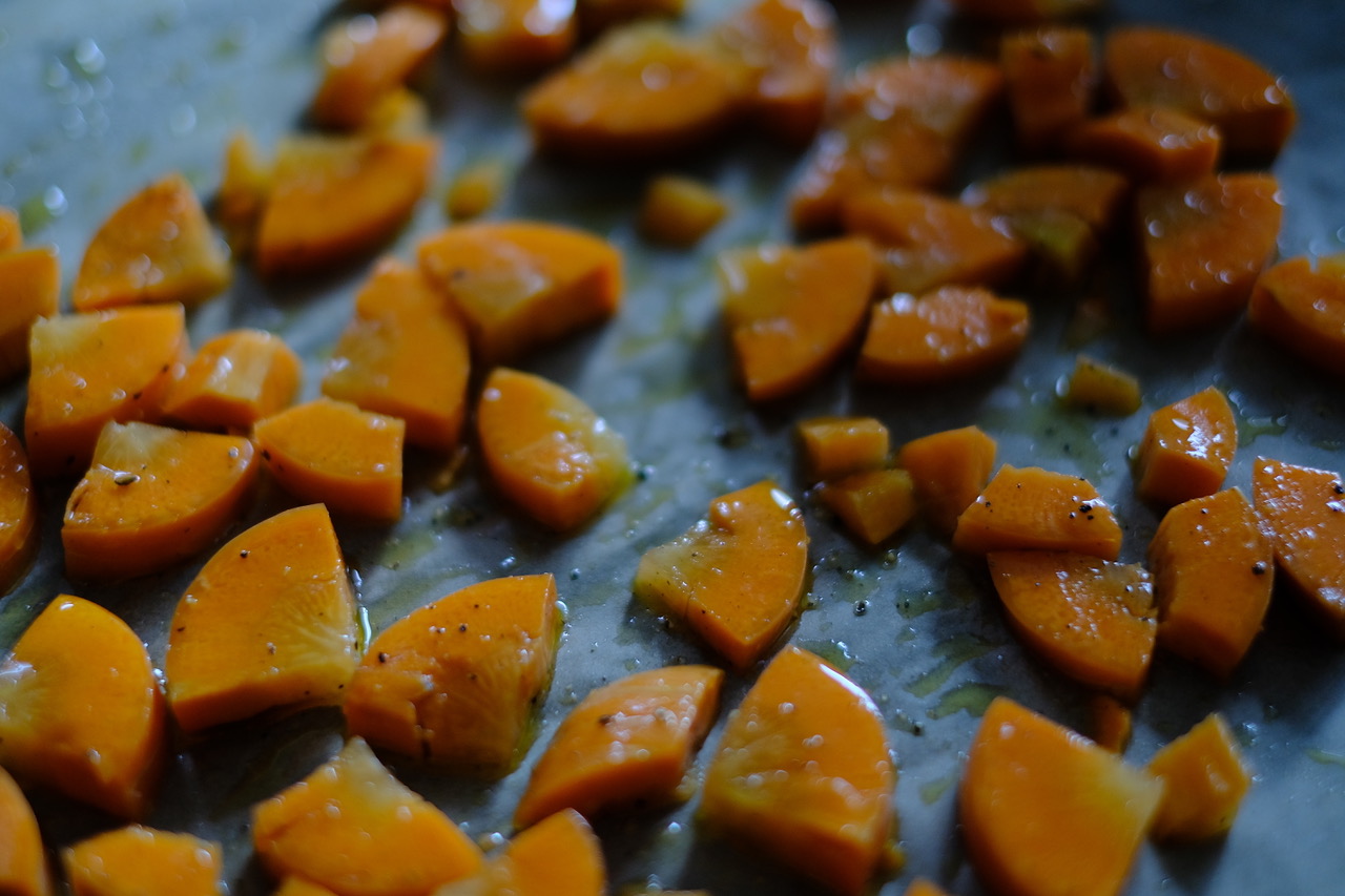 Also, das Rezept ist tatsächlich einfach und geht so: 2 Karotten (200g) in 2 cm großen Stücken mit 1 EL Olivenöl, ¼ TL Salz und etwas Pfeffer bei 220°C auf Backpapier im Backrohr 20 Minuten rösten. In 2 EL Öl in einer Pfanne 1 gehackte Zwiebel mit 1 TL Kümmel und 1½ Kreuzkümmel (ich hab beide gequetscht) 10 Minuten rösten, bis die Zwiebel goldbraun ist. 200 g Mangold (ich hatte frisch geernteten, daher zuerst nur die ausgeschnittenen Stängel und fast erst zum Schluss die nur die Blätter), die Karotten, ¼ kg gekochte Kichererbsen (ich hatte getrocknete 12 h eingeweicht, das Einweichwasser weggeschüttet und dann etwa 20 Minuten gekocht; beim zweiten Mal getrocknete aus Castelluccio, nicht eingeweicht, in einer guten halben Stunde aber ebenso weich), 75 ml Wasser (da brauchte ich etwas mehr), ½ TL Salz vermischen und 5 Minuten kochen. Mit dem Saft einer halben Zitrone abschmecken, einen Esslöffel griechisches Joghurt dazu etwas Öl darüber und (entscheidend, aber nicht zu viel: insgesamt 5 g): Blattkoriander!